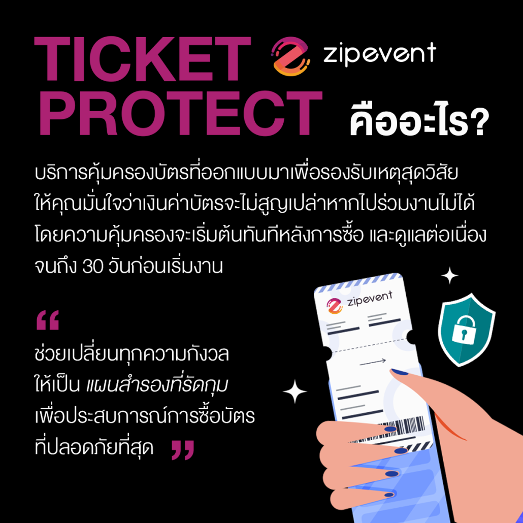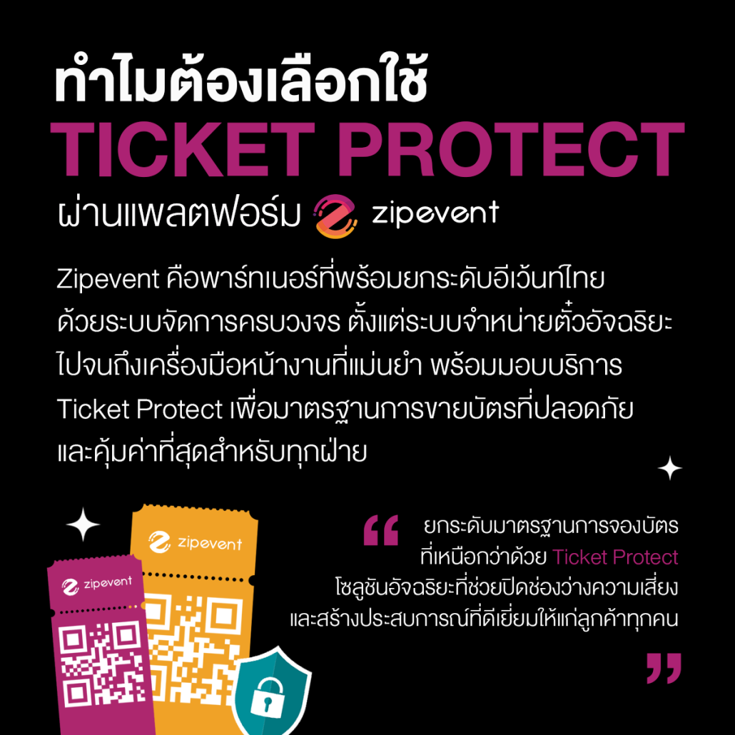 เคยมั้ย? จองบัตรคอนเสิร์ตหรืออีเว้นท์ที่อยากไปมานาน แต่กลับต้องกังวลว่าจะมีเหตุสุดวิสัยที่ทำให้ไปไม่ได้ในวันจริง เพื่อปิดช่องว่างความกังวลนี้ Zipevent ในฐานะแพลตฟอร์มจำหน่ายบัตรแถวหน้าของไทย จึงขอนำเสนอ ‘Ticket Protect’ บริการเสริมอัจฉริยะที่ออกแบบมาเพื่อคุ้มครองการซื้อบัตรของคุณโดยเฉพาะ ไม่ใช่แค่ตัวช่วยลดความเสี่ยง แต่คือการยกระดับมาตรฐานความมั่นใจที่ตอบโจทย์ทั้ง “ผู้ซื้อ” ให้กล้าตัดสินใจ และ “ผู้จัด” ให้บริหารงานได้อย่างมืออาชีพ เปลี่ยนทุกความกังวลให้เป็นความสบายใจในทุกการทำรายการ
