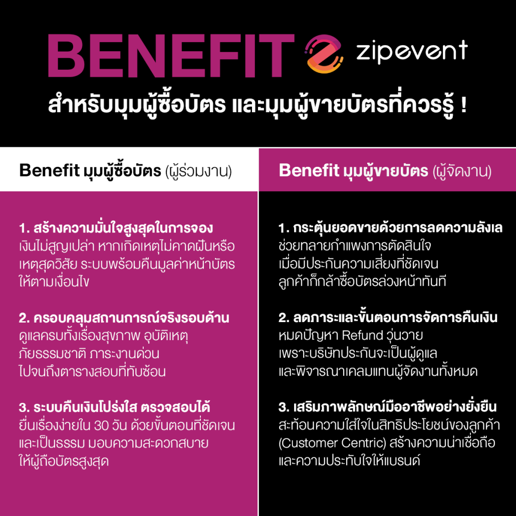 การมอบสิทธิประโยชน์ผ่านแพลตฟอร์ม Zipevent สะท้อนให้เห็นว่าผู้จัดงานมีความใส่ใจในทุกรายละเอียดของลูกค้า ตั้งแต่วินาทีแรกที่ซื้อบัตรจนจบงาน ภาพลักษณ์ความโปร่งใสและความใส่ใจนี้เองที่จะกลายเป็นแรงดึงดูดสำคัญที่สร้าง Brand Loyalty และความพึงพอใจสูงสุดให้แก่กลุ่มเป้าหมาย